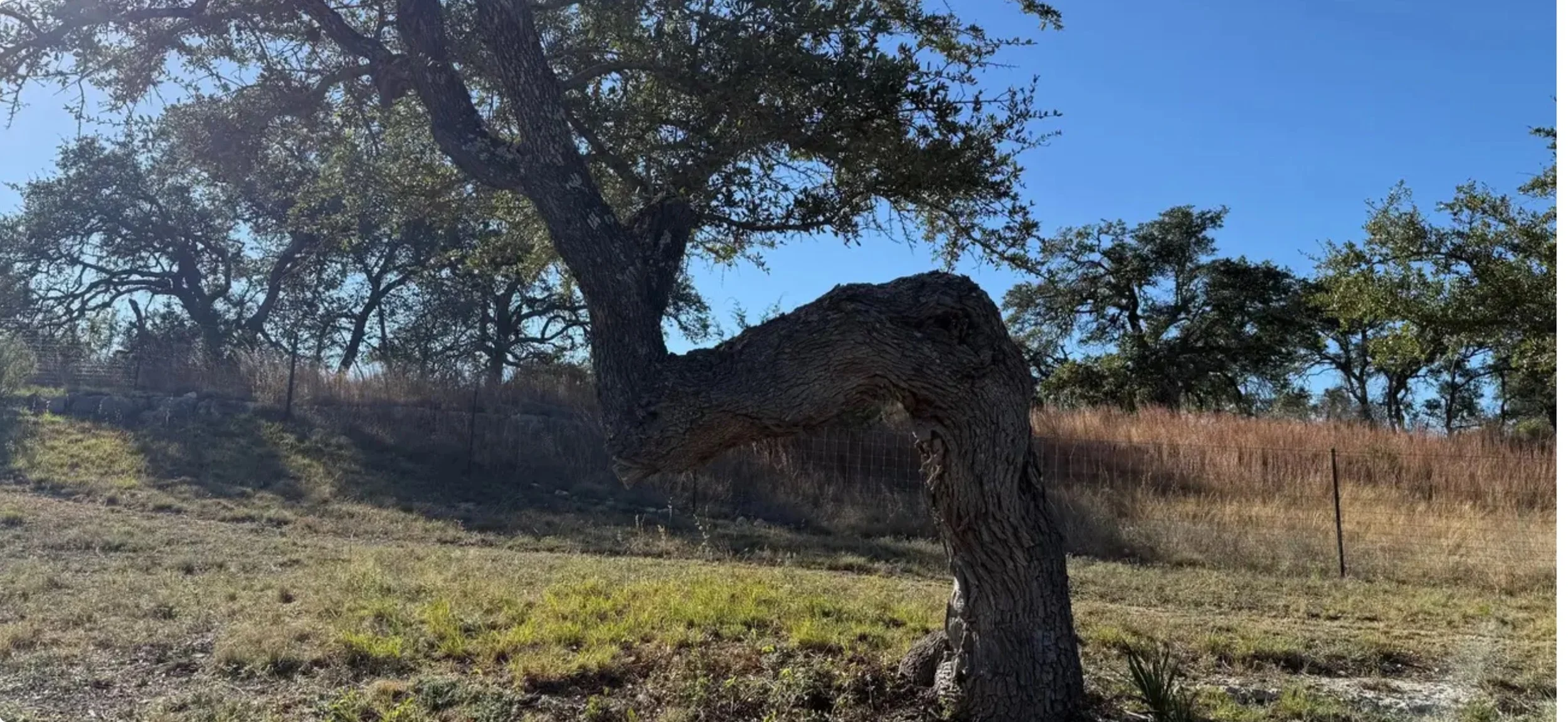 This nice specimen of a bent, "Z"-shaped tree limb is a live oak tree. It is located in the Colorado River Indian Basin Trailway of Travis County. This is a very contorted manipulation of a live oak tree limb whose significance is still undetermined.